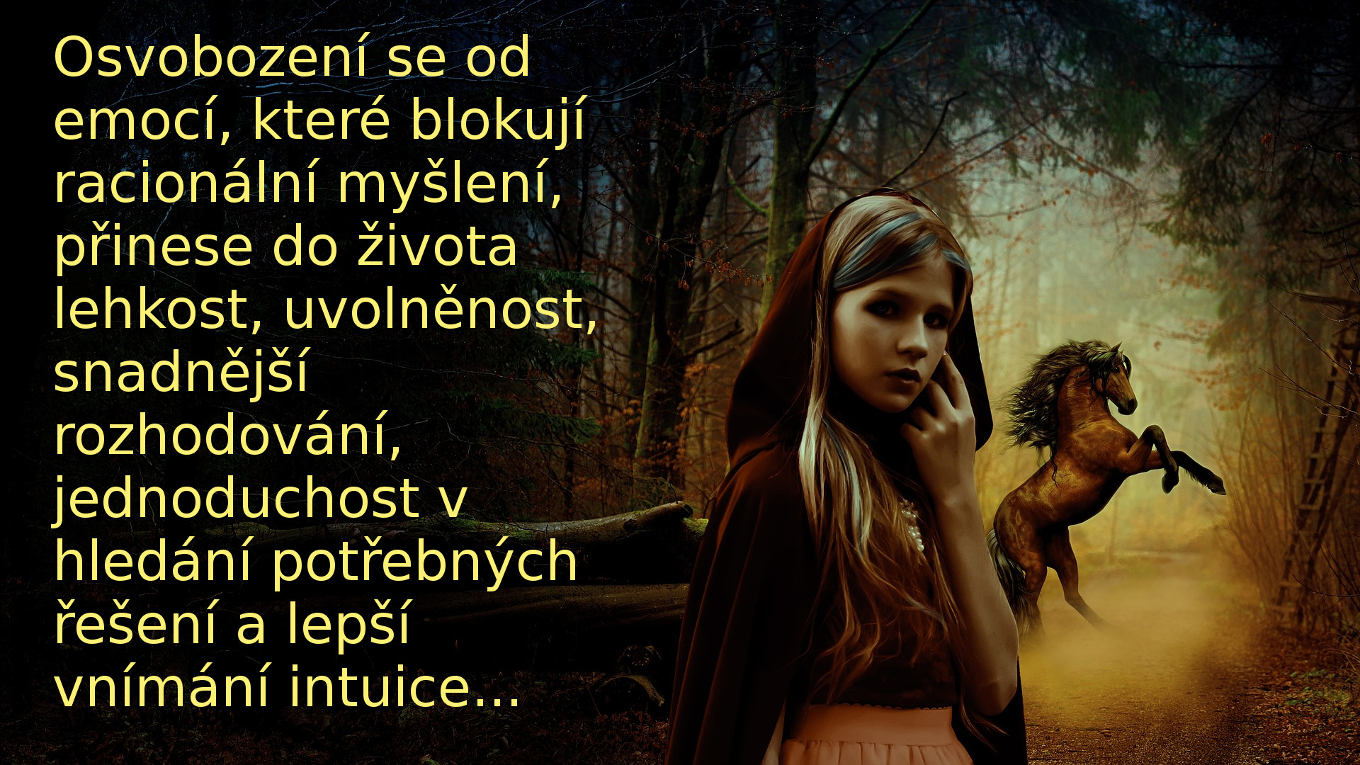 Na jednom z dalších tréninků mi povídá: "Já se pořád bránila, že nejsem přece žádný posera a že si musím dokázat poradit. Nechtěla jsem vás v tomto slyšet. Ta vypjatá situace mě k tomu donutila a byla to ta nejlepší věc, kterou jsem mohla udělat. Strach zmizel, vztek zmizel, najednou cítím klid a můžu zase normálně s koněm pracovat. Ne jako dřív, jinak, lépe, snadněji."